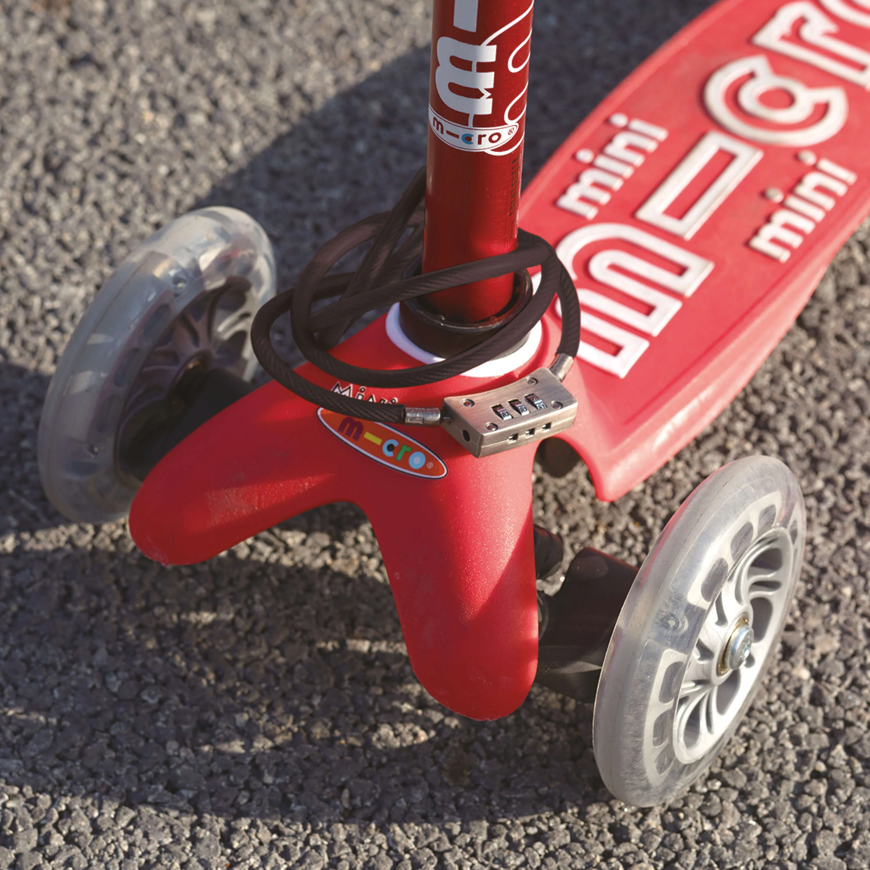 Our Micro Lock has been cleverly designed to give total peace of mind when out scooting, its secure combination code lock means no lost key headaches. And it sits securely on the stem when not in use, ready for action whenever the need arises. Suitable for all scooters and bikes